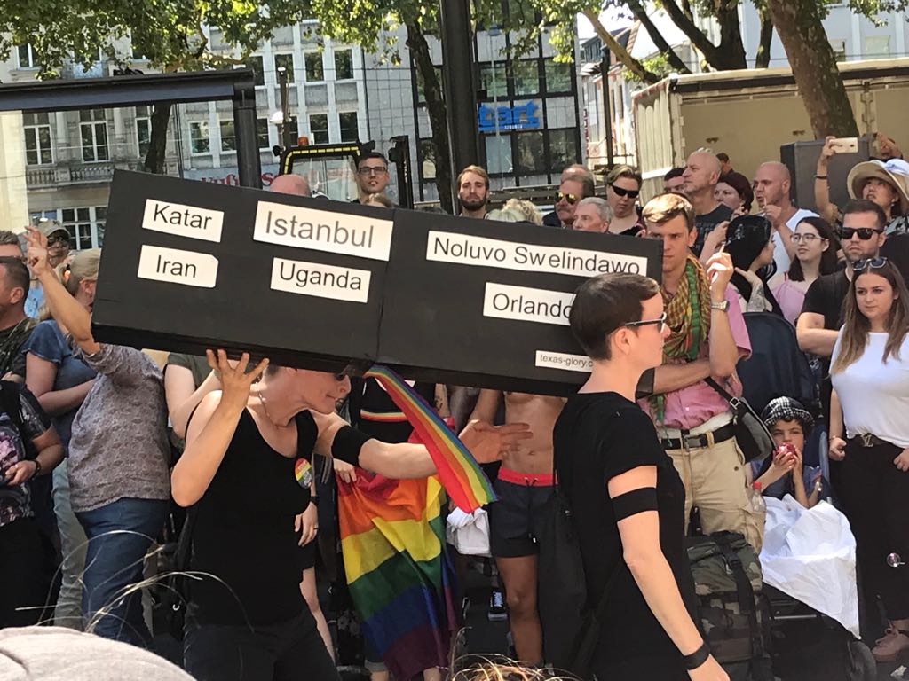 in memory of the people who couldn’t walk with us in the parade in cologne in 2018 and for those who can’t live free, we carried a coffin. when do you ever have the opportunity to reach one million spectators? dear organizers of the cologne pride, we are so sorry for not signing up upfront. we just sneaked in and led the demo.
