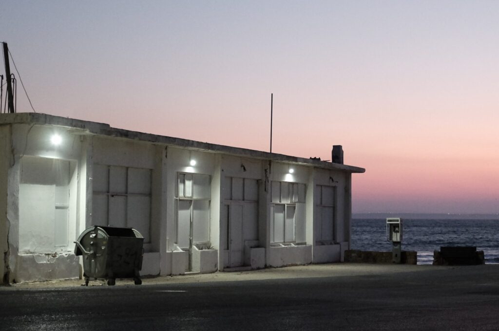 the sun is slowly rising when we get the message about a landing in the bay of karfas. on our arrival, the dawn has broken. the sun shines in soft red. except for the continuous sound of the waves it is ghostly quiet. on the square that borders the beach there is a simple white building. people stand lined up silently in sparse neon light. mainly small children, women, and teenagers lean motionless against the building’s wall. some people are wrapped in rescue blankets sparkling silver and golden in the rising sun – a bizarre and disturbing sight.